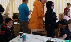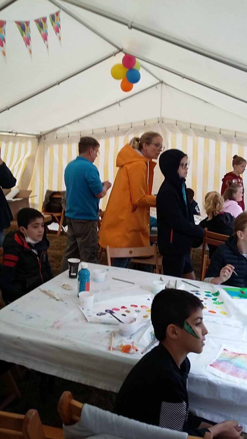 Eines der Gartenzelte wandelte unser Künstler Rainer Mörk mit tatkräftiger Unterstützung seiner Familie in ein Künstlerstudio um. Es entstanden farbenfrohe Gemälde auf kleinen Leinwänden, die die Künstler am Abend als Erinnerung an das Sommerfest mit nach Hause nahmen.